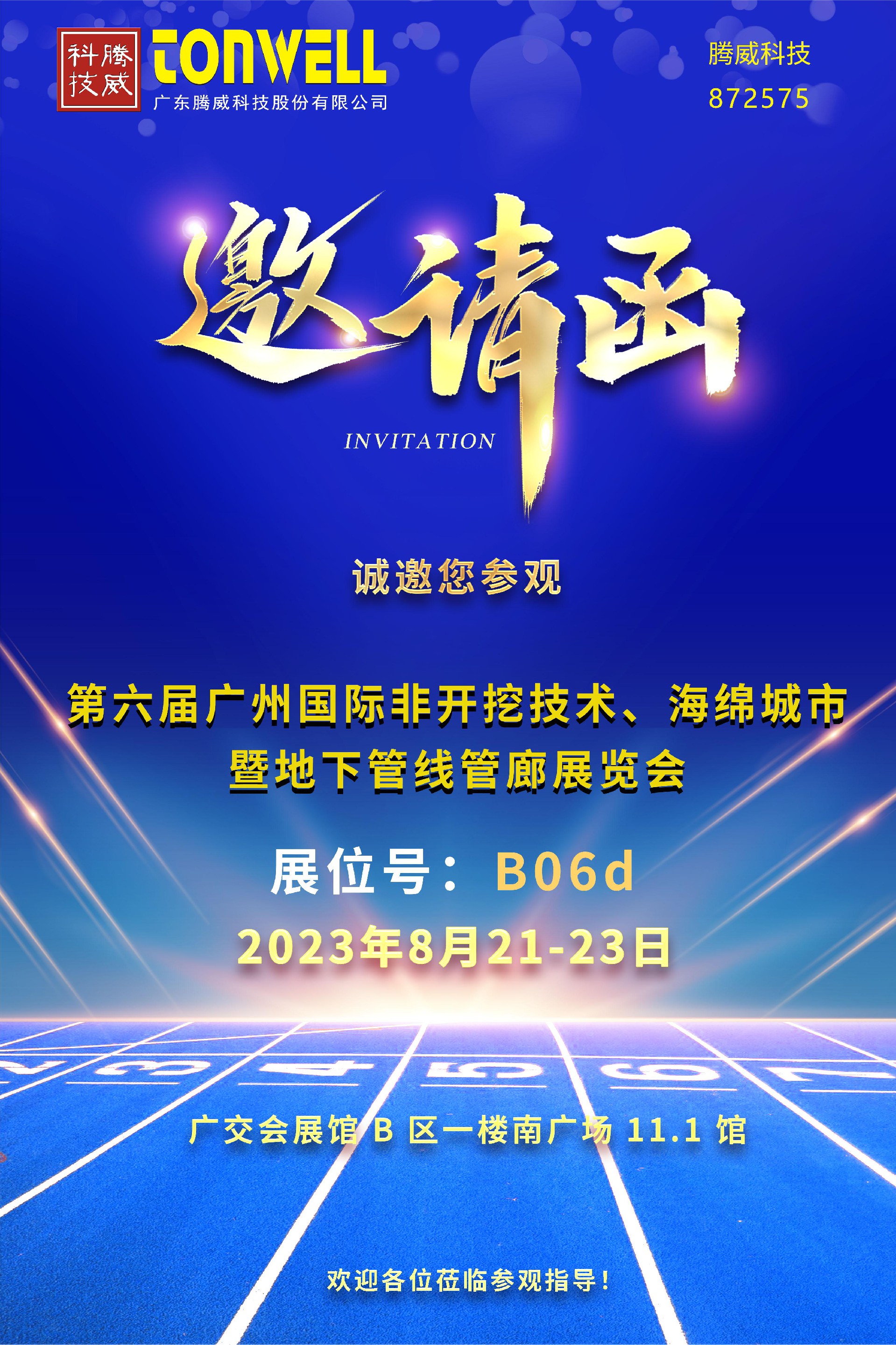 2023年8月21日-23日第六屆廣州國際非開挖技術(shù)、海綿城市暨地下管線管廊展覽會在廣州·廣交會展館B區(qū)舉辦廣東騰威科技股份有限公司誠邀各位合作伙伴及客戶蒞臨參觀、洽談合作!我們,廣州見!